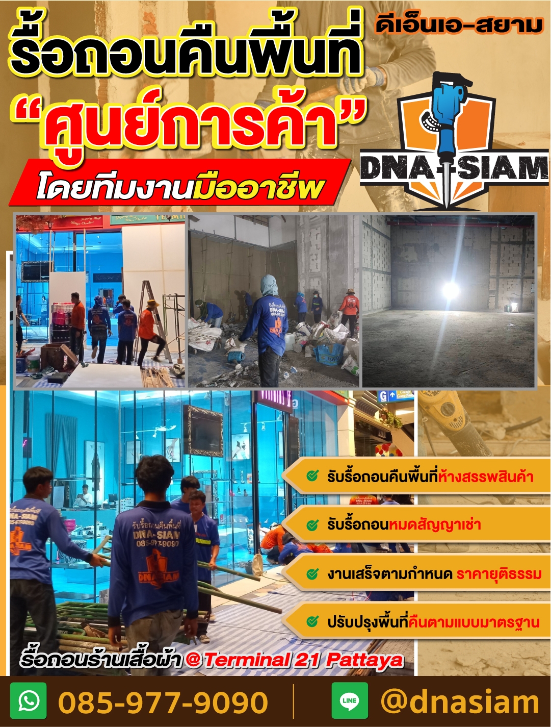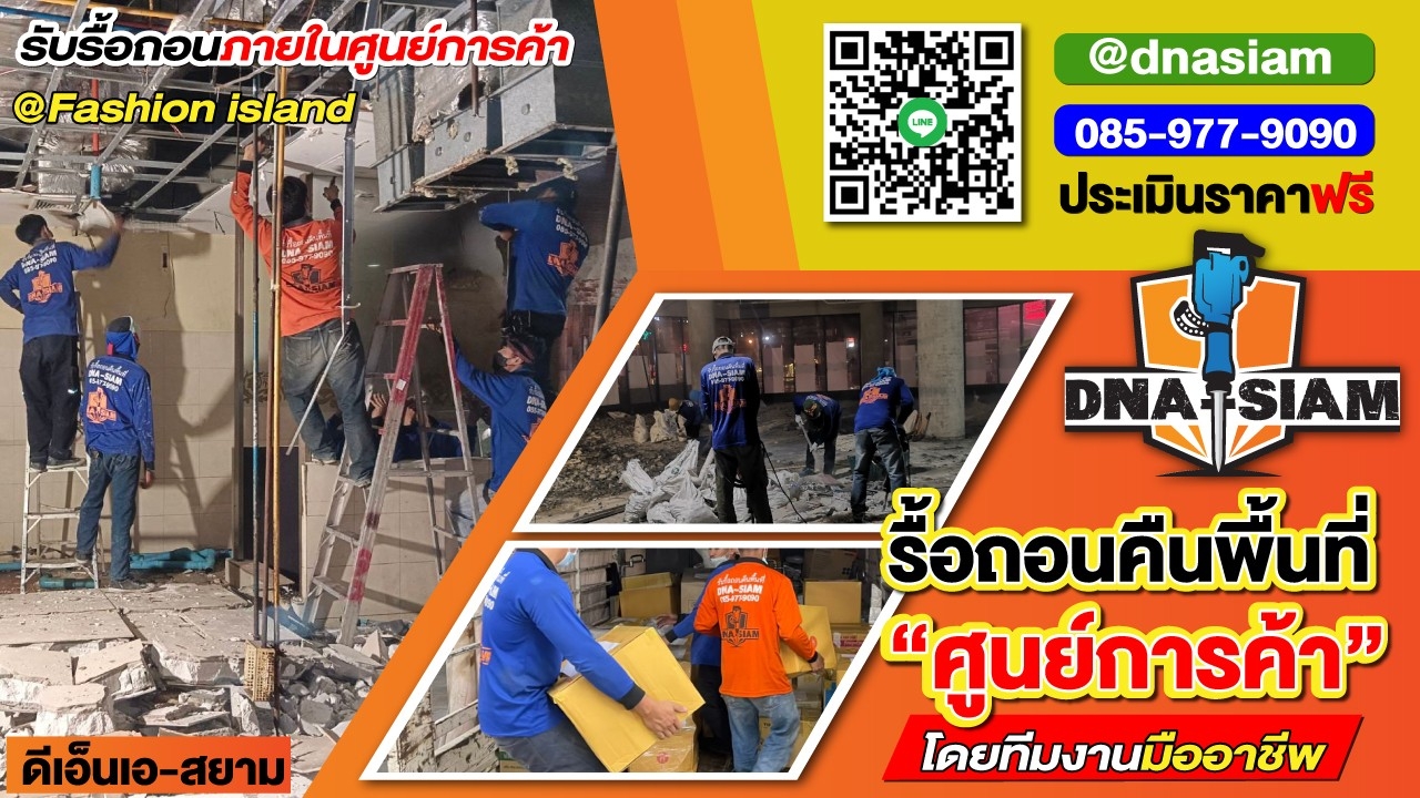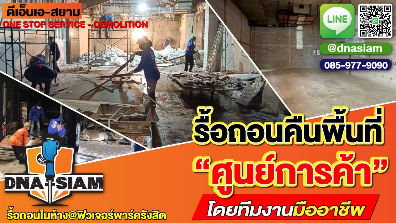 DNA-SIAM ดีเอ็นเอ-สยาม มีประสบการณ์ในงานรื้อถอนคืนพื้นที่ภายในห้างสรรพสินค้าและพื้นที่เช่าหลากหลายประเภท เราให้ความสำคัญกับทุกขั้นตอน ตั้งแต่สำรวจหน้างาน สรุปขอบเขตงาน วางแผนการรื้อถอน ไปจนถึงส่งมอบพื้นที่ในสภาพเรียบร้อย เพื่อช่วยให้ลูกค้าลดความกังวลและปิดงานได้อย่างมั่นใจ