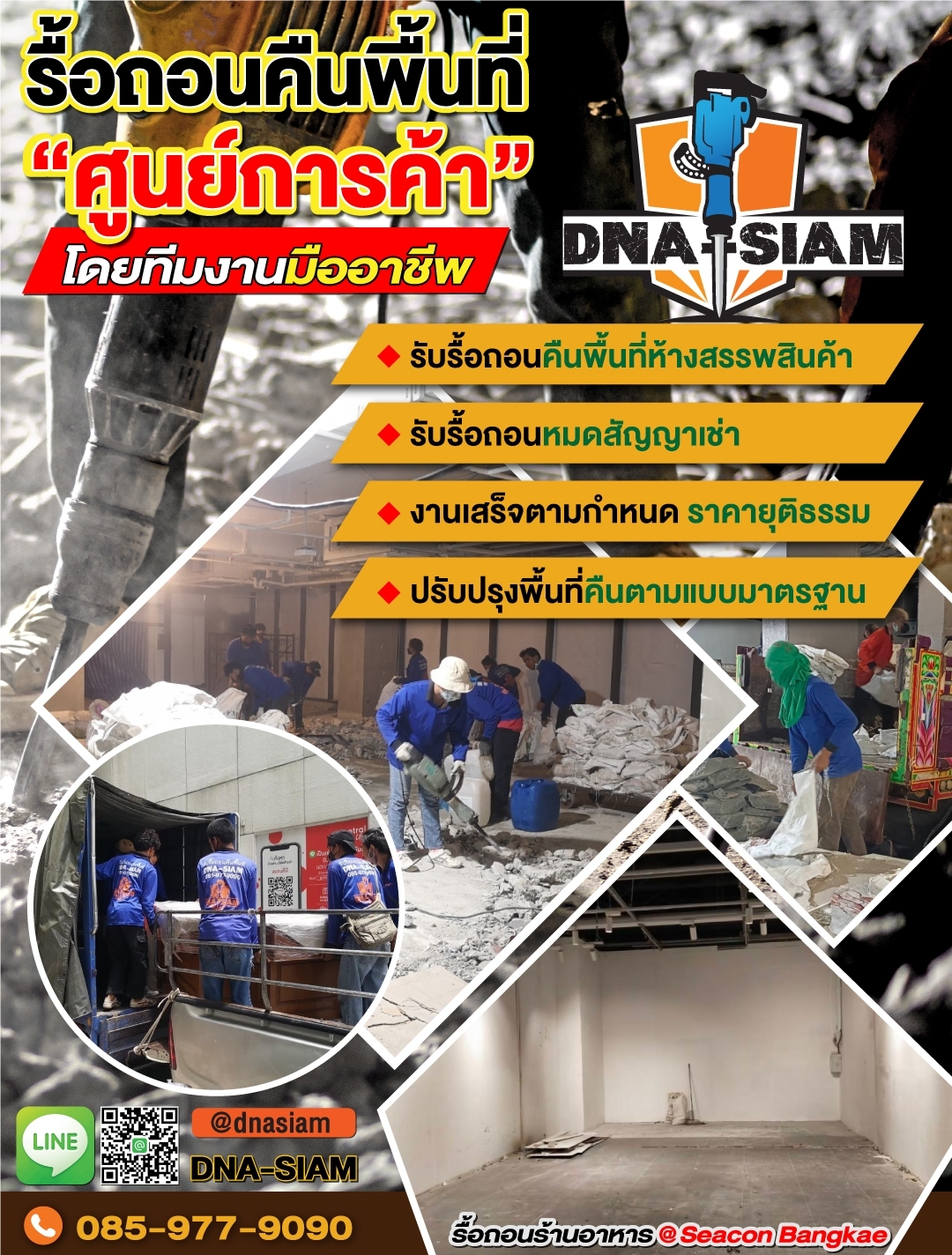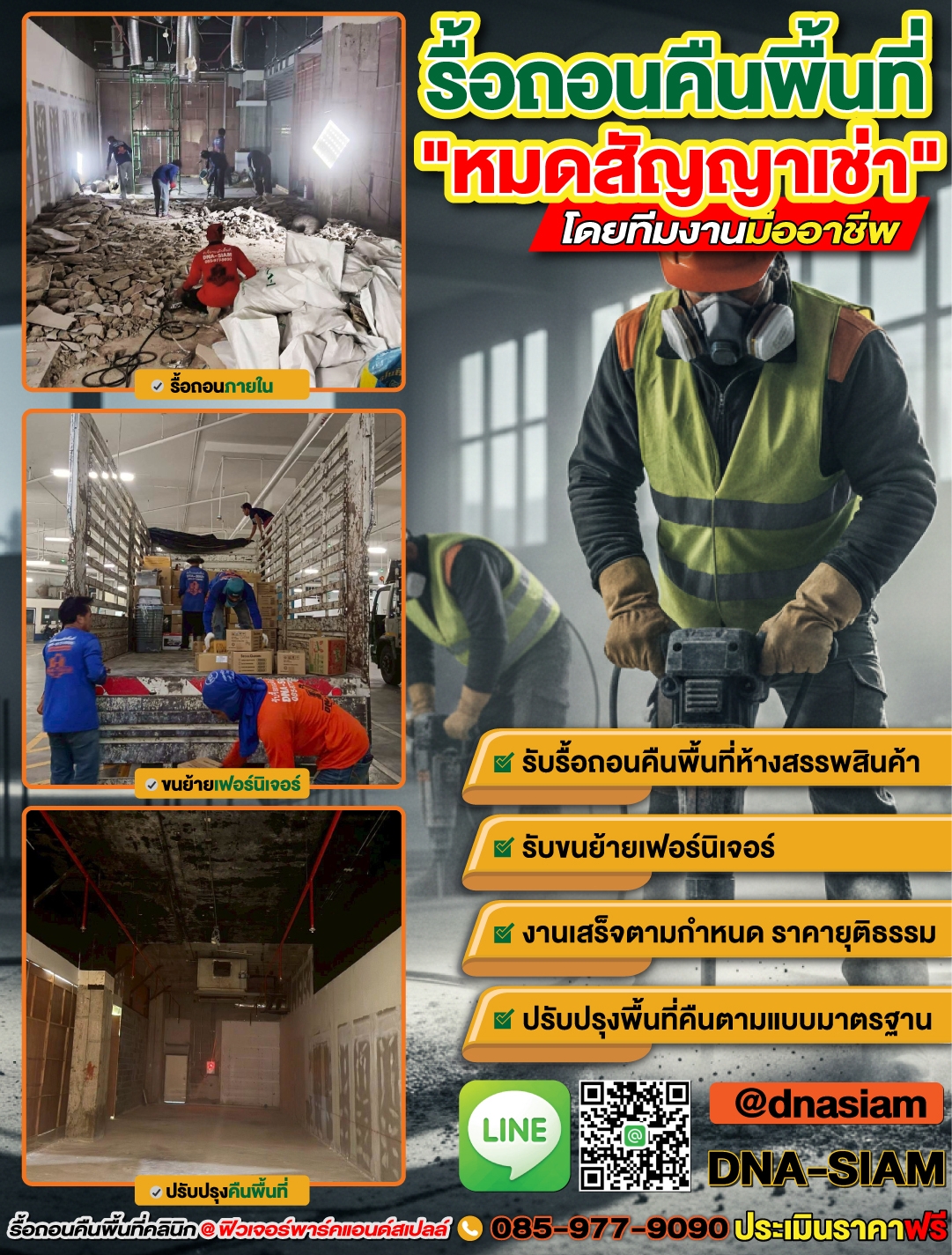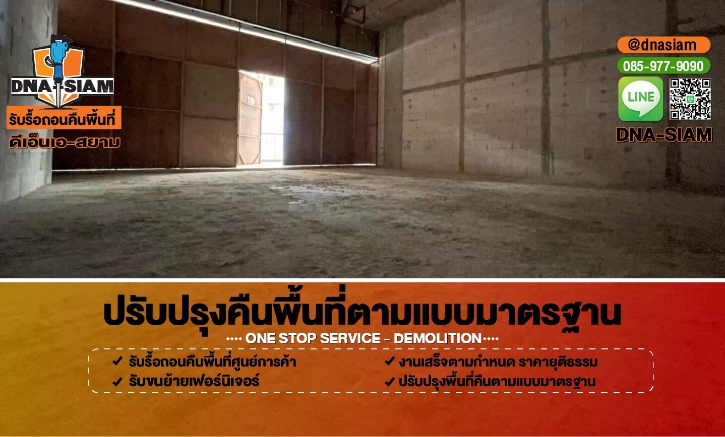 DNA-SIAM ดีเอ็นเอ-สยาม พร้อมให้คำปรึกษา สำรวจหน้างาน และประเมินราคาเบื้องต้น เพื่อช่วยให้การรื้อถอนและคืนพื้นที่ของคุณเป็นเรื่องง่ายขึ้น
